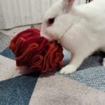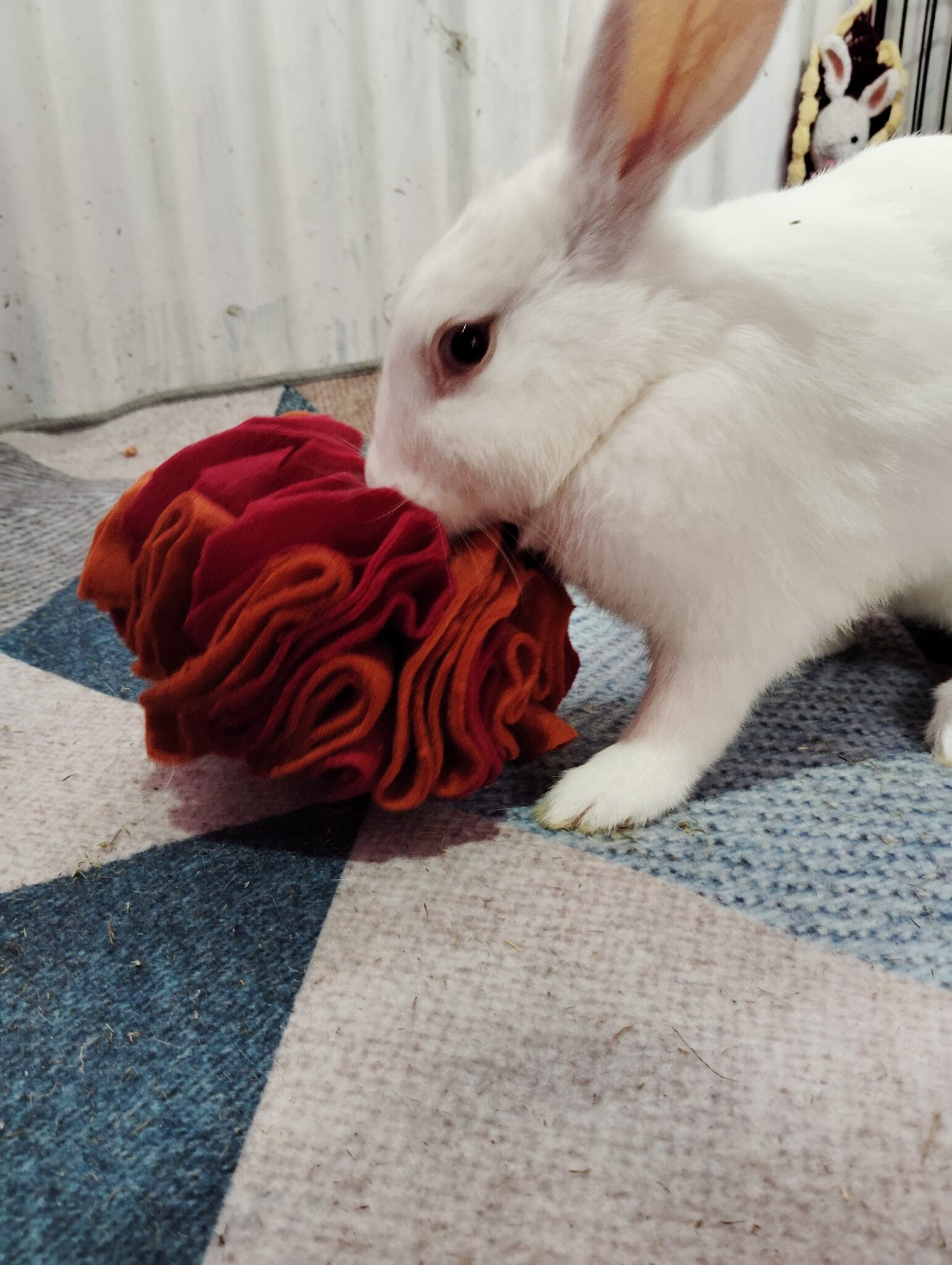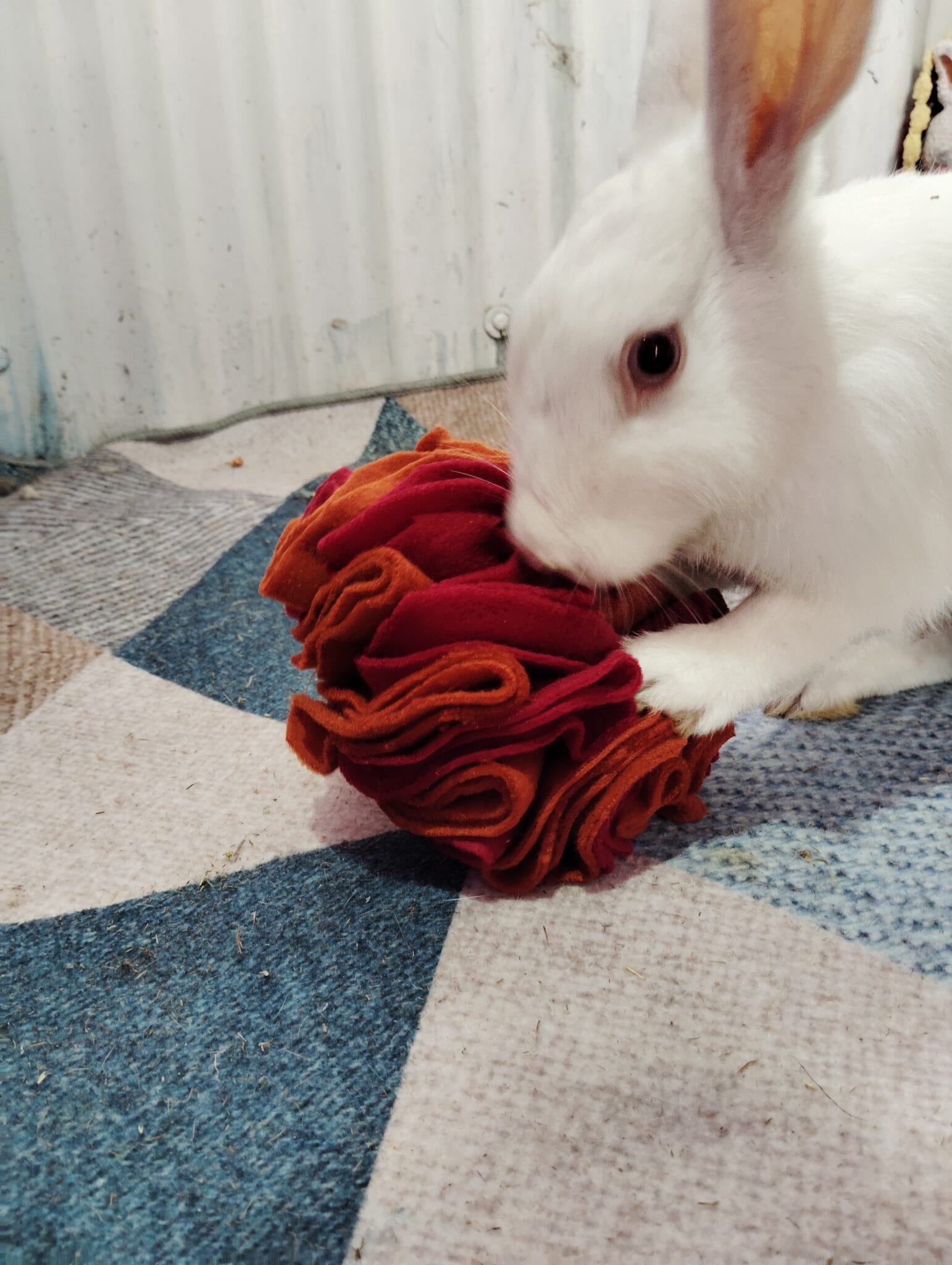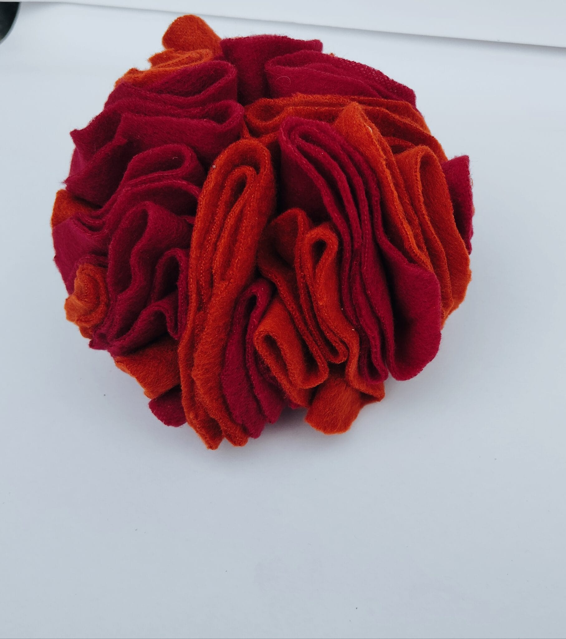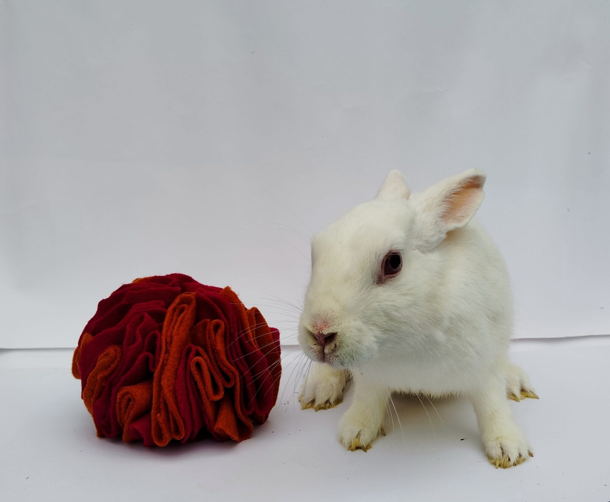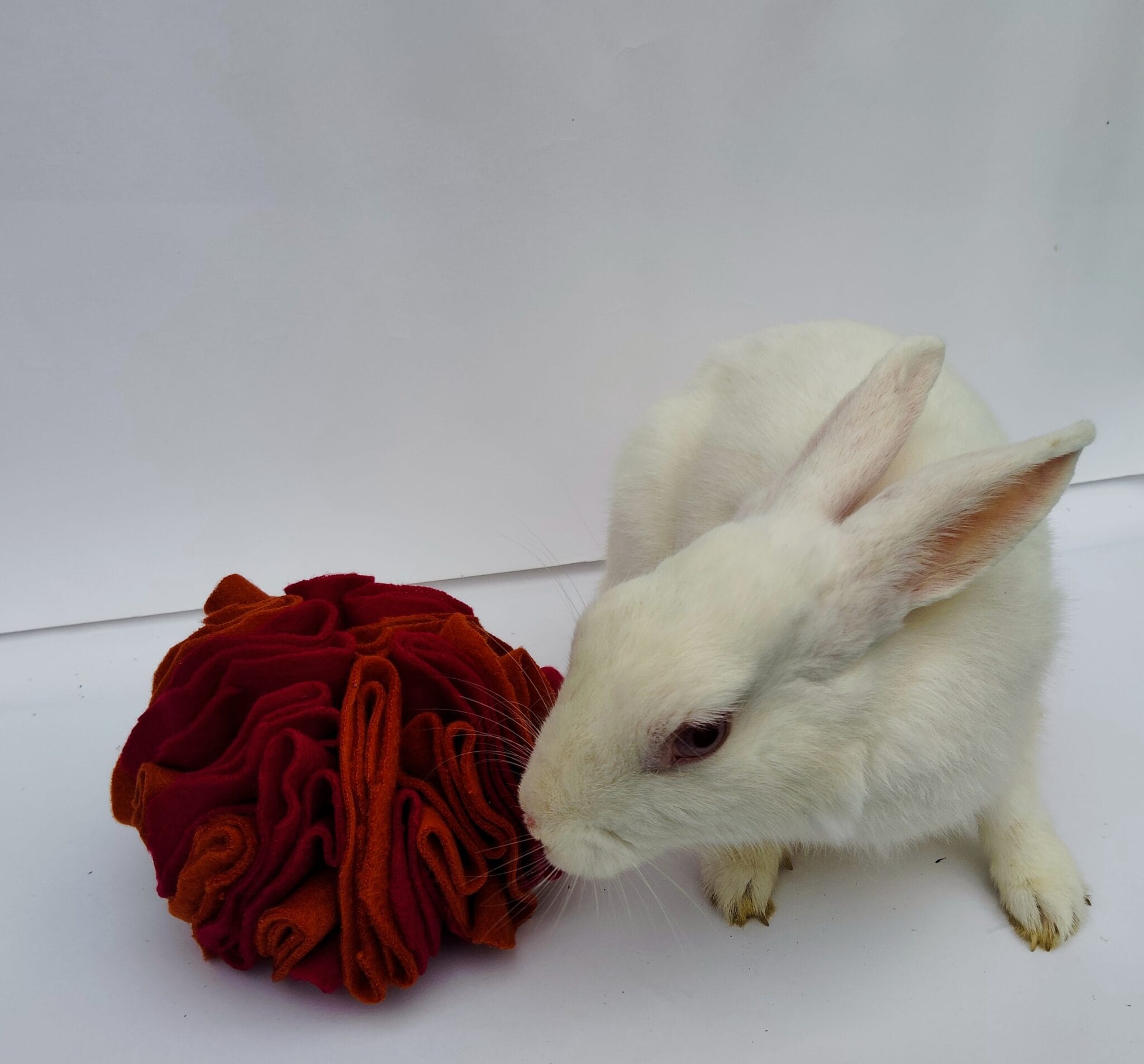 Bring the heat in a fun way with our Fireball Snuffle Ball – part of our special Bunny Summer Hamper! This vibrant enrichment toy, inspired by summer sunsets and campfire vibes, is handmade using soft fleece in warm red and orange hues.