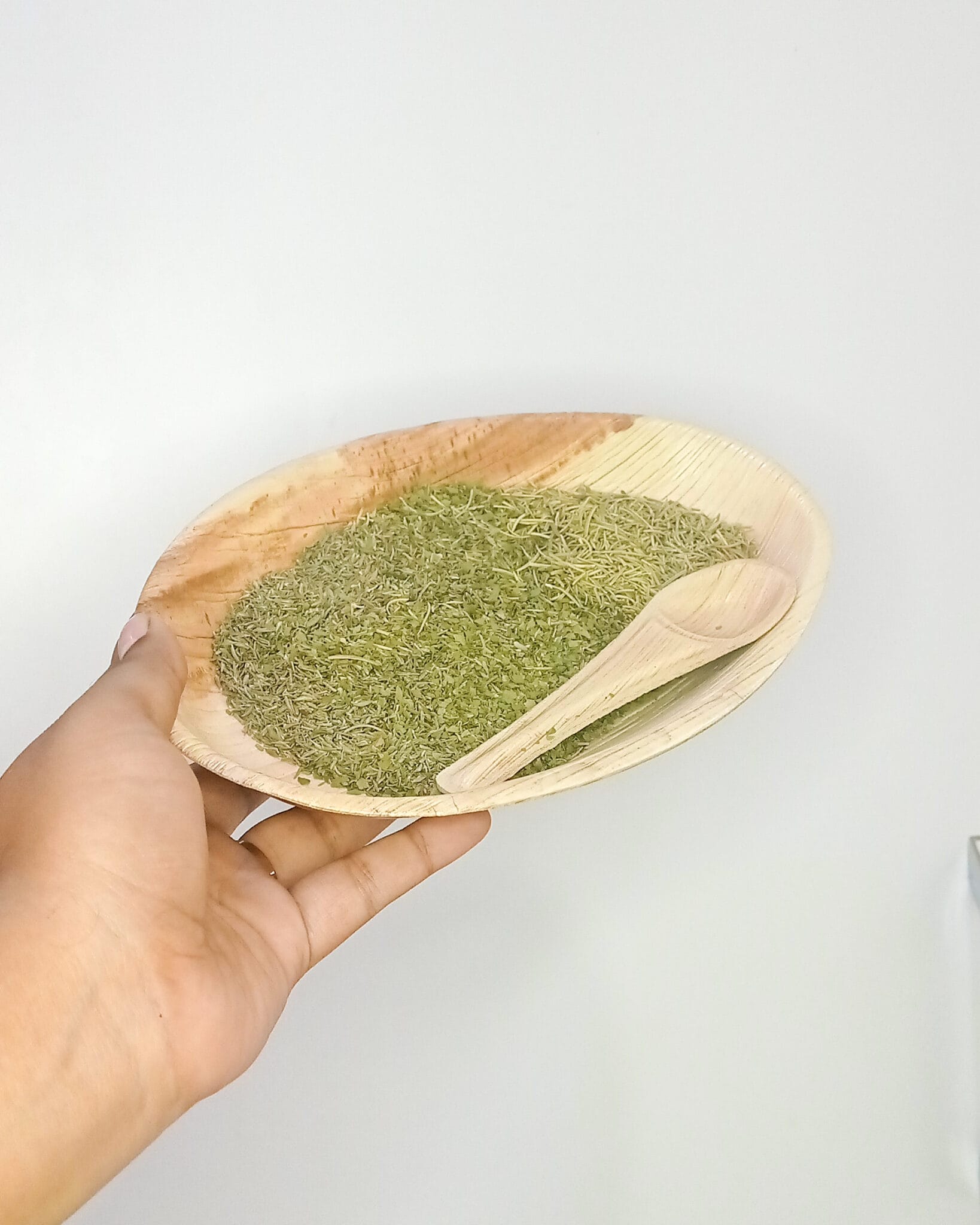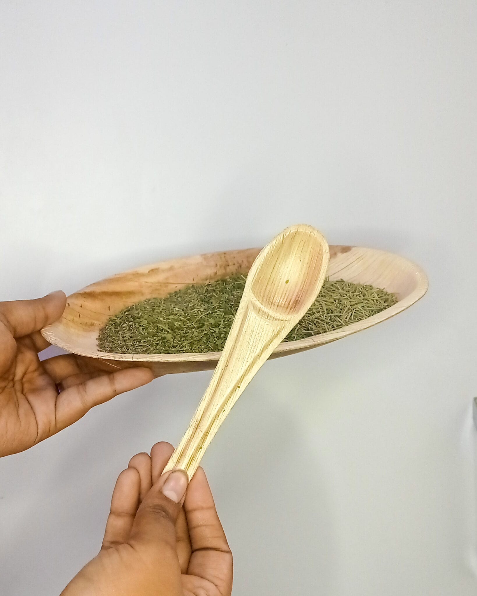 Green Herbs Nutritious Tray with Spoon and Chew Palm Leaf Plate