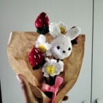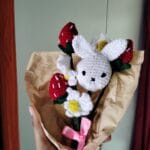 A cute and thoughtful gift handcrafted with love! This bouquet features a soft crochet bunny, juicy red strawberries, and cheerful daisies – all wrapped in rustic kraft paper and tied with a pink ribbon. Perfect for birthdays, anniversaries, baby showers, or simply to brighten someone’s day!