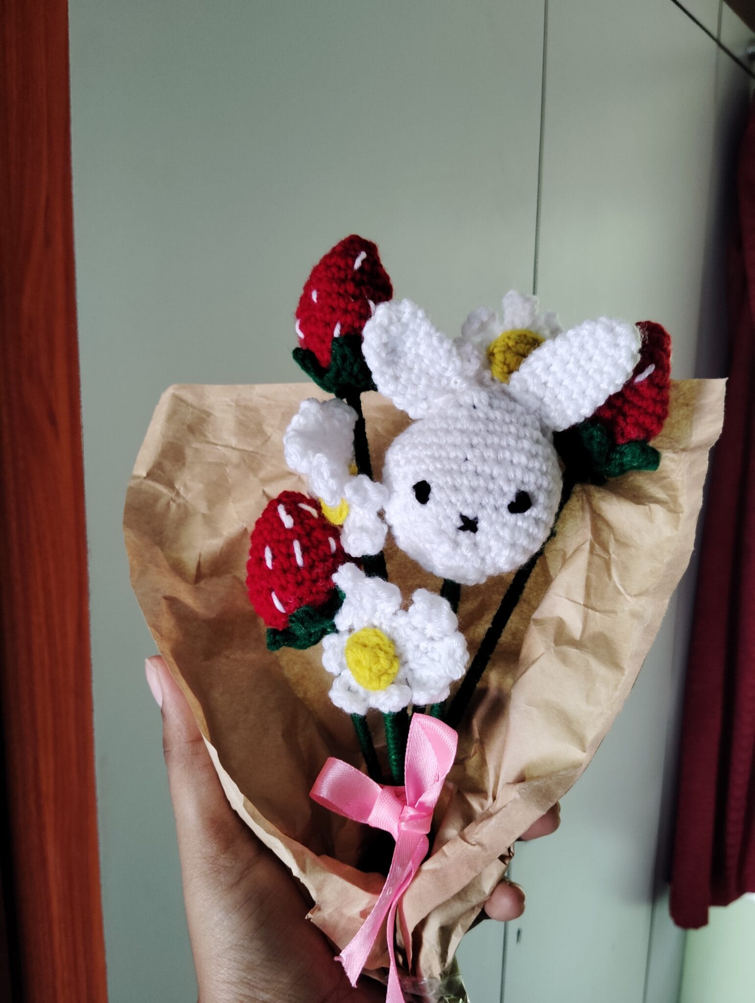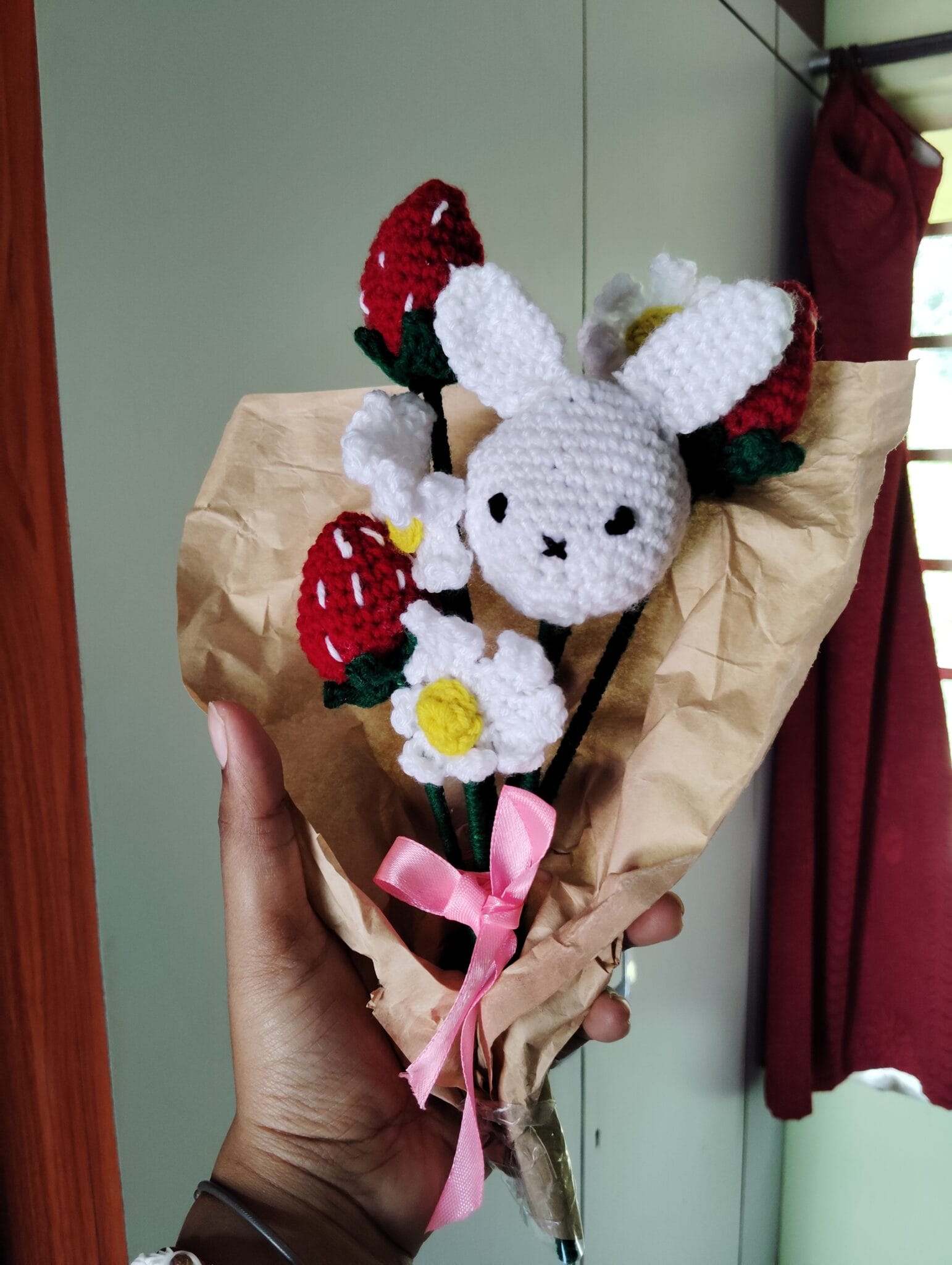 Handmade Crochet Bouquet – Bunny, Strawberries & Daisies