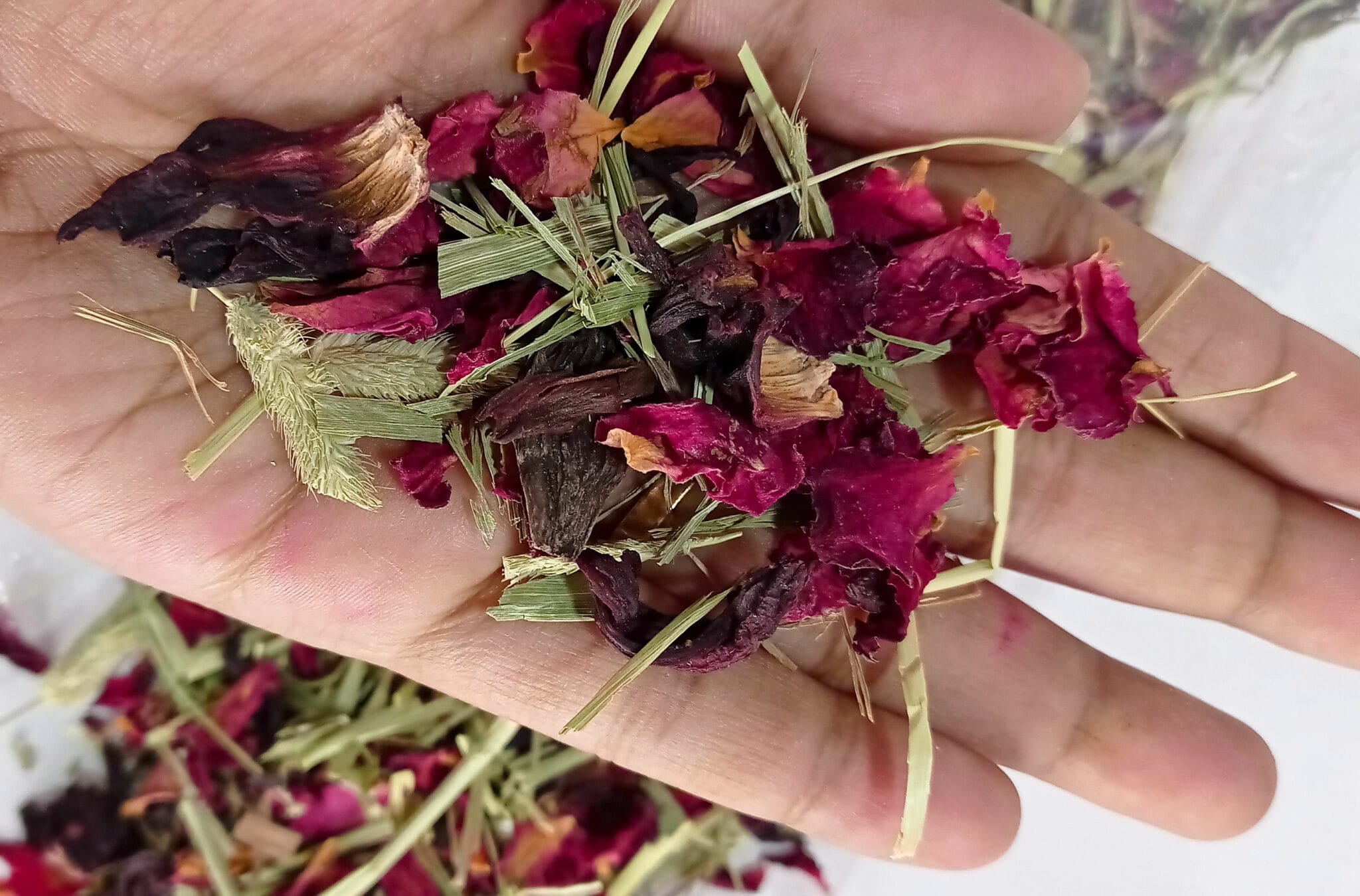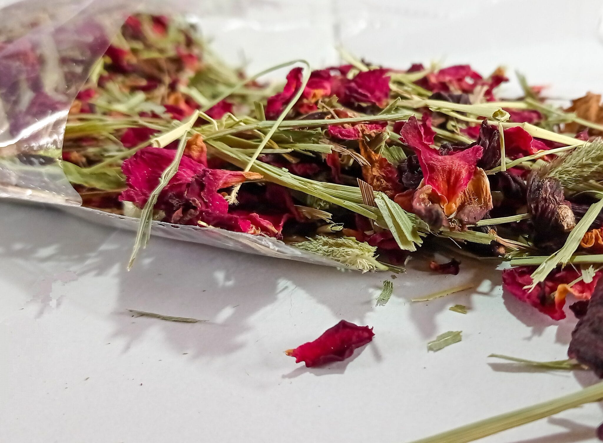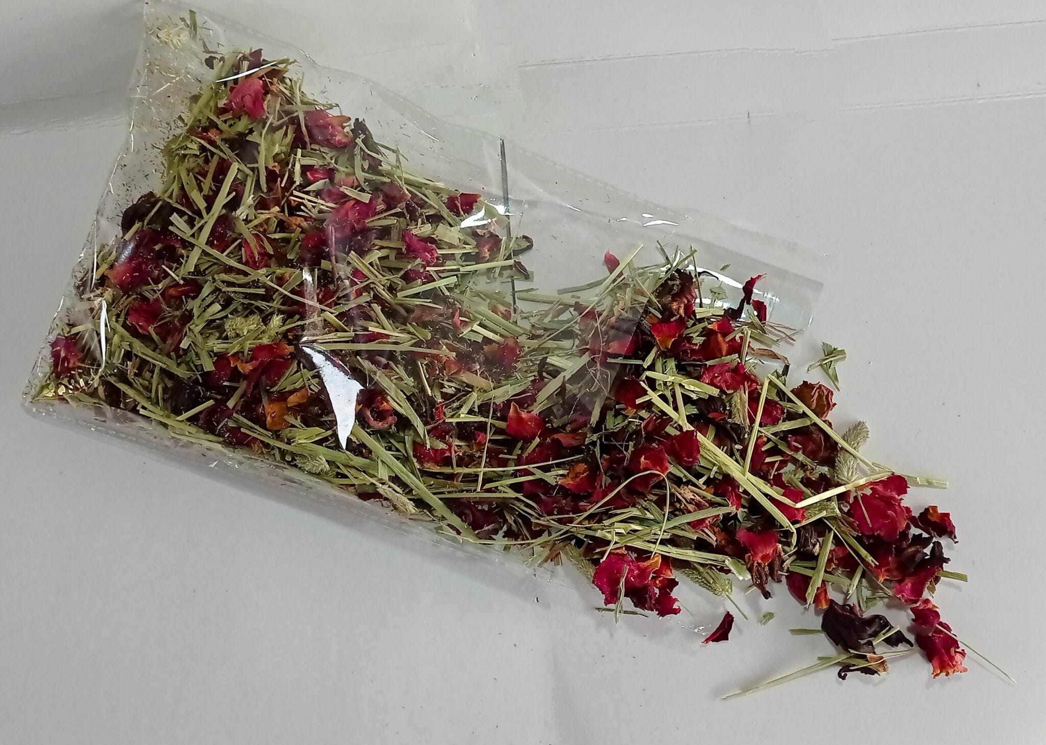 This mix Contains: hibiscus flower,rose flower and Timothy hay.